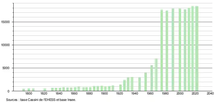 - ↑ Par convention dans Wikipédia, le principe a été retenu de n’afficher dans le tableau des recensements et le graphique, pour les populations de référence postérieures à 1999, que les populations correspondant à une enquête exhaustive de recensement pour les communes de moins de 10 000 habitants, et que les populations des années 2006, 2011, 2016, etc. pour les communes de plus de 10 000 habitants, ainsi que la dernière population de référence publiée par l’Insee pour l'ensemble des communes.