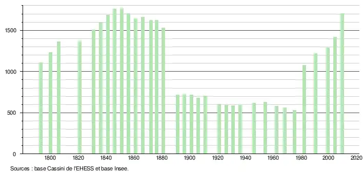 - ↑ Dans le tableau des recensements et le graphique, par convention dans Wikipédia, le principe a été retenu, pour les populations légales postérieures à 1999 de n’afficher dans le tableau des recensements et le graphique que les populations correspondant à l'année 2006, première population légale publiée calculée conformément aux concepts définis dans le décret no 2003-485 du 5 juin 2003, et les années correspondant à une enquête exhaustive de recensement pour les communes de moins de 10 000 habitants, ainsi que la dernière population légale publiée par l’Insee.