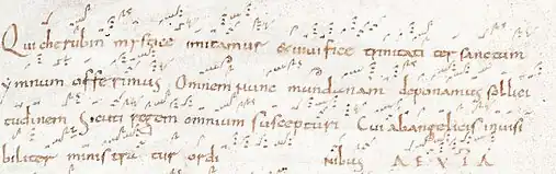 Le Cherubikon translittéré est annoté de neumes paléo-franciques entre les lignes de texte. Les neumes paléo-franciques étaient diastématiques ; aucun manuscrit du Cherubikon en latin avec notation diastématique ne nous est parvenu. On suppose que la mélodie est, comme les premiers Cherubikons byzantins, dans l'intonation de l'echos plagal deutérus[9].