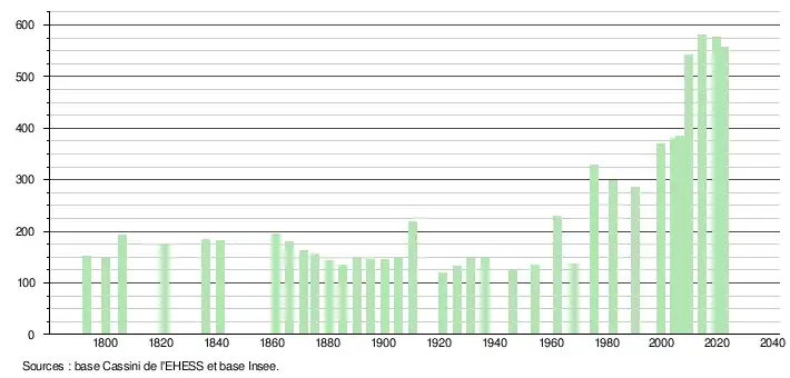 L'évolution du nombre d'habitants est connue à travers les recensements de la population effectués dans la commune depuis 1793. Pour les communes de moins de 10 000 habitants, une enquête de recensement portant sur toute la population est réalisée tous les cinq ans, les populations de référence des années intermédiaires étant quant à elles estimées par interpolation ou extrapolation[21]. Pour la commune, le premier recensement exhaustif entrant dans le cadre du nouveau dispositif a été réalisé en 2004[22].