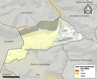 Le retrait-gonflement des sols argileux est susceptible d'engendrer des dommages importants aux bâtiments en cas d’alternance de périodes de sécheresse et de pluie. La totalité de la commune est en aléa faible (44,5 % au niveau départemental et 48,5 % au niveau national). Sur les 61 bâtiments dénombrés sur la commune en 2019, aucun n'est en aléa moyen ou fort, à comparer aux 75 % au niveau départemental et 54 % au niveau national. Une cartographie de l'exposition du territoire national au retrait gonflement des sols argileux est disponible sur le site du BRGM[21],[Carte 3].