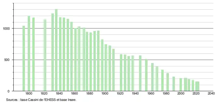 L'évolution du nombre d'habitants est connue à travers les recensements de la population effectués dans la commune depuis 1793. Pour les communes de moins de 10 000 habitants, une enquête de recensement portant sur toute la population est réalisée tous les cinq ans, les populations de référence des années intermédiaires étant quant à elles estimées par interpolation ou extrapolation[21]. Pour la commune, le premier recensement exhaustif entrant dans le cadre du nouveau dispositif a été réalisé en 2005[22].