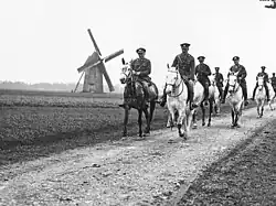 Après avoir vu les exploits des unités montées des Boers en Afrique du Sud durant la seconde guerre des Boers entre 1899 et 1902, la Grande-Bretagne augmente ses réserves de cavalerie[6]. Elles sont utilisées dès les premiers jours de la Première Guerre mondiale. Le , le premier tir britannique en Belgique est effectué par un cavalier, Edward Thomas, des 4th Royal Irish Dragoon Guards à côté de Casteau, durant une patrouille la veille de la bataille de Mons[7]. Dix-neuf jours après la première mobilisation anglo-saxonne, le , le régiment du 9th Queen's Royal Lancers, mené par David Campbell, attaque des troupes d'infanterie allemandes avec un escadron du 4th Dragoon Guards. Campbell suit les ordres qui sont de charger les lignes ennemies, même s'il pense qu'il aurait été plus prudent de se battre à pied. Les Britanniques y perdent 250 hommes et 300 chevaux. Le 7 septembre, ses troupes attaquent une nouvelle fois, cette fois-ci face au Premier corps des dragons allemand, un autre régiment de lanciers[8]. La même année, la Household Cavalry britannique accomplit son avant-dernière opération à dos de cheval, durant la Grande Retraite des Alliés. Après avoir atteint l'Aisne et la ligne de tranchées, les cavaliers se révèlent inefficaces. Alors que des divisions montées sont toujours formées en Grande-Bretagne, celles du front s'habituent rapidement à se battre à pied[9]. Les Britanniques continuent d'en utiliser tout au long de la guerre, et en 1917, la Household Cavalry lance la dernière charge à cheval dans une attaque de diversion sur la Ligne Hindenburg, près d'Arras. Sur les ordres du Field Marshal Douglas Haig, les Life Guards et Horse guards, accompagnés par les hommes de la 10th Royal Hussars, attaquent sous les tirs massifs des mitrailleuses allemandes et à travers les fils de fer barbelé. Les hussards y perdent les deux-tiers de leurs hommes[9],[El 2]. La dernière perte pour la cavalerie britannique avant l'armistice avec l'Allemagne est celle de George Edwin Ellison, de la troupe C du 5th Royal Irish Lancers, tué par un tireur d'élite, alors que son régiment se dirigeait vers Mons, le [10].