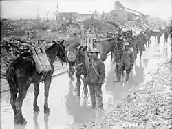 Bien que la cavalerie forme l'utilisation militaire la plus connue du cheval, traditionnellement, celui-ci ainsi que les ânes et mulets sont toujours employés pour porter les paquetages[34], le ravitaillement et les munitions, et tirer les pièces d'artillerie. Malgré les progrès des engins motorisés, le cheval demeure inégalable dès lors qu'il s'agit de se déplacer sur un terrain accidenté, et même à la fin de la guerre, sa valeur est intacte en ce qui concerne la logistique[B 2],[35]. Les zones de boue profonde sur le front, causées par l'endommagement des systèmes de drainage et les inondations, rendent les équidés vitaux puisqu'ils sont les seuls capables d'amener provisions et munitions jusqu'aux tranchées dans ces conditions[S 1],[M 3]. Après la bataille de la crête de Vimy en avril 1917, un soldat canadien déclare que « les chevaux avaient de la boue jusqu'au ventre. Nous voulions les attacher à une ligne de piquetage entre les roues des chariots durant la nuit, mais ils se seraient noyés avant le lendemain matin. Nous avons dû en abattre un assez grand nombre »[M 3].
