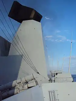 - 2 tourelles avec canon OTO-Melara de calibre 76 mm totalement automatisées, mises en œuvre à partir du Central Opération, et permettent une cadence de tir de 60 à 120 obus par minute. Chaque tourelle, d’une masse de 5,5 tonnes, est gyrostabilisée, afin de pouvoir maintenir sa position malgré les mouvements du bâtiment. Elle dispose d'un barillet contenant 60 obus qui peut être servi en temps réel par des servants récupérant les munitions arrivant depuis la soute à munitions via un ascenseur. Plus de 1 000 obus de différents types (tir contre terre, contre surface ou antiaérien) sont stockés.La portée maximale est de 13 kilomètres contre les cibles de surfaces[18].