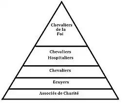 Le premier grade est celui des « associés de charité » qui contribuent seulement en priant et en cotisant. Les « associés » pensaient être dans une association pieuse de chrétiens nostalgiques de l'ancien régime[2]. Les « écuyers » étaient mis au courant du rétablissement de la chevalerie, mais seuls les « chevaliers » étaient initiés durant une cérémonie. Ensuite « les Chevaliers Hospitaliers » s'occupaient spécialement des soins des prisonniers et des hôpitaux. Le dernier grade, le statut suprême était celui de « Chevaliers de la foi ». Eux seuls connaissent l'étendue de la société et ses objectifs politiques et religieux[3]. Après la Restauration française l'Ordre a gardé ses grades secrets mais a tourné son activité vers le Parlement.