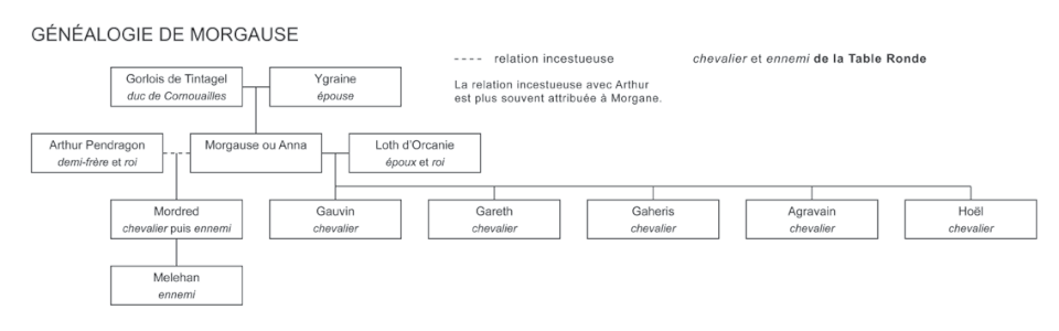 - Morgause est la mère de Mordred avec Arthur. C'est la femme de Lot d’Orcanie et la mère de Gauvain, Gareth (Gaheriet), Gaheris (Guerrehet), Agravain et de Mordred avec Arthur, envoyée par Morgane. Elle élève Mordred dans la haine de son père, le roi Arthur.