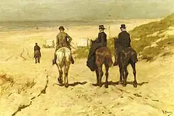 Anton Mauve (1838-1888) est rattaché à l'École de La Haye, connue pour son portrait des conditions de vie des pêcheurs de Schéveningue. Ici, cependant, Mauve a choisi un autre sujet, en peignant des bourgeois à cheval — dont une cavalière en amazone — le long de la plage, avec des cabines de bain en arrière-plan.