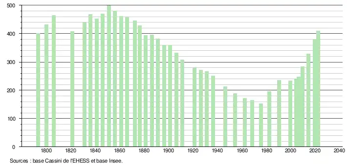 L'évolution du nombre d'habitants est connue à travers les recensements de la population effectués dans la commune depuis 1793. Pour les communes de moins de 10 000 habitants, une enquête de recensement portant sur toute la population est réalisée tous les cinq ans, les populations de référence des années intermédiaires étant quant à elles estimées par interpolation ou extrapolation[12]. Pour la commune, le premier recensement exhaustif entrant dans le cadre du nouveau dispositif a été réalisé en 2004[13].