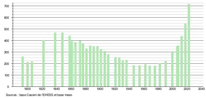L'évolution du nombre d'habitants est connue à travers les recensements de la population effectués dans la commune depuis 1793. Pour les communes de moins de 10 000 habitants, une enquête de recensement portant sur toute la population est réalisée tous les cinq ans, les populations de référence des années intermédiaires étant quant à elles estimées par interpolation ou extrapolation[16]. Pour la commune, le premier recensement exhaustif entrant dans le cadre du nouveau dispositif a été réalisé en 2007[17].