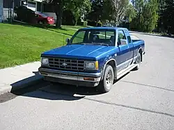, sur berthierville, (consulté le )1983–1990 Chevrolet S-10 Cabine régulièreLe premier pick-up compact de GM est le Chevrolet LUV de 1972. La crise du pétrole de 1973 a forcé les ingénieurs à redessiner un pick-up destiné à un usage domestique, à partir des pièces qui étaient souvent utilisées sur d'autres véhicules en fabrication pendant cette période. Beaucoup de pièces de la série G Body ont été utilisées. La largeur de la voie était similaire aux anciennes sous-compacts GM H-body (Vega / Monza). En 1982 le premier pick-up a été présenté au public. Le moteur de base (fabriqué au Japon et importé) était un quatre cylindres Isuzu de 1,9 L (RPO LR1) partagé avec le LUV et l'Isuzu P'UP, avec un V6 de 2,8 L en option. Les modèles de GMC et de Chevrolet étaient identiques excepté la calandre. Une version à cabine allongée et quatre roues motrices a été offerte en option en 1983 avec deux nouveaux moteurs - un moteur quatre cylindres de 2,0 L (RPO LQ2) des automobiles à plateforme J ainsi qu'un moteur diesel quatre cylindres Isuzu de 2,2 L (RPO LQ7).