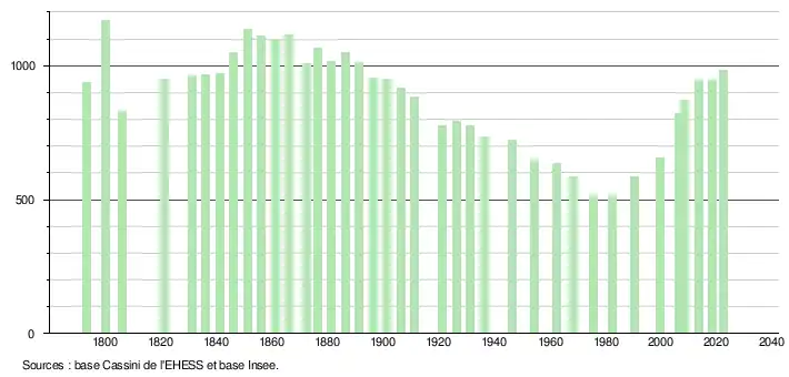L'évolution du nombre d'habitants est connue à travers les recensements de la population effectués dans la commune depuis 1793. Pour les communes de moins de 10 000 habitants, une enquête de recensement portant sur toute la population est réalisée tous les cinq ans, les populations de référence des années intermédiaires étant quant à elles estimées par interpolation ou extrapolation[27]. Pour la commune, le premier recensement exhaustif entrant dans le cadre du nouveau dispositif a été réalisé en 2008[28].