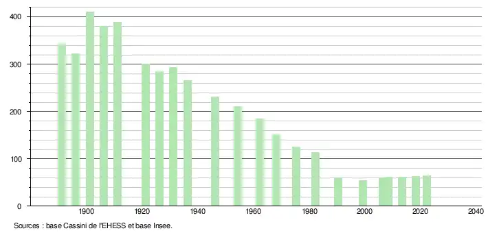 L'évolution du nombre d'habitants est connue à travers les recensements de la population effectués dans la commune depuis 1891. Pour les communes de moins de 10 000 habitants, une enquête de recensement portant sur toute la population est réalisée tous les cinq ans, les populations de référence des années intermédiaires étant quant à elles estimées par interpolation ou extrapolation[22]. Pour la commune, le premier recensement exhaustif entrant dans le cadre du nouveau dispositif a été réalisé en 2008[23].