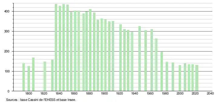 L'évolution du nombre d'habitants est connue à travers les recensements de la population effectués dans la commune depuis 1793. Pour les communes de moins de 10 000 habitants, une enquête de recensement portant sur toute la population est réalisée tous les cinq ans, les populations de référence des années intermédiaires étant quant à elles estimées par interpolation ou extrapolation[31]. Pour la commune, le premier recensement exhaustif entrant dans le cadre du nouveau dispositif a été réalisé en 2006[32].