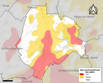 Le retrait-gonflement des sols argileux est susceptible d'engendrer des dommages importants aux bâtiments en cas d’alternance de périodes de sécheresse et de pluie. 65,9 % de la superficie communale est en aléa moyen ou fort (90,2 % au niveau départemental et 48,5 % au niveau national). Sur les 93 bâtiments dénombrés sur la commune en 2019, 67 sont en aléa moyen ou fort, soit 72 %, à comparer aux 91 % au niveau départemental et 54 % au niveau national. Une cartographie de l'exposition du territoire national au retrait gonflement des sols argileux est disponible sur le site du BRGM[20],[21].