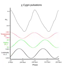 χ Cygni est bien plus grande mais aussi plus froide que le Soleil. Malgré sa faible température de surface, elle est des milliers de fois plus lumineuse que le Soleil en raison de sa grande taille. Elle pulse aussi bien en rayon et en température, qui varient sur une période d'environ 409 jours. Sa température varie entre 2 400 et 2 700 K et son rayon entre 350 et 480 R☉. Ces pulsations font que sa luminosité varie entre 6 000 et 9 000 L☉, et elles expliquent pourquoi la magnitude visuelle de l'étoile peut varier de plus de 10 magnitudes[7]. Ce grand intervalle de variation est créé par un déplacement du rayonnement électromagnétique vers l'infrarouge quand sa température décroît, et par la formation à des températures froides de molécules qui absorbent sa lumière visuelle[33].