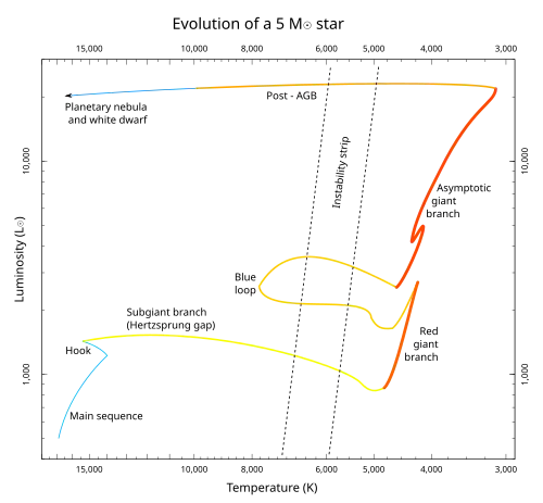 Les étoiles AGB deviennent plus lumineuses, plus grandes, et plus froides au fur et à mesure qu'elles perdent de la masse et que leurs coquilles internes se rapprochent progressivement de la surface. Le taux de perte de masse s'accroît d'autant plus qu'elles perdent de la masse, tandis qu'au même moment la luminosité s'accroît, et que de plus en plus de produits de fusion sont remontés à la surface. Elles « gravissent » la branche asymptotique des géantes jusqu'à ce que leur taux de perte de masse devienne si extrême qu'elles commencent à gagner en température de surface. Elles entrent alors dans la phase post-AGB, avant qu'elles ne terminent leur vie en naine blanche[41].