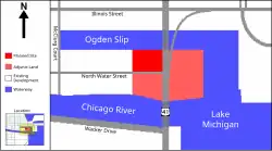 Le chantier se trouve à l'embouchure de la rivière Chicago, sur la rive du lac Michigan, à la bordure nord du secteur du Loop (Downtown Chicago), le grand quartier d'affaires de la ville. Le site est bordé au nord par le canal Ogden[6], à l'est par le boulevard Lake Shore Drive, la rivière Chicago au sud et les immeubles résidentiels existant à l'ouest.