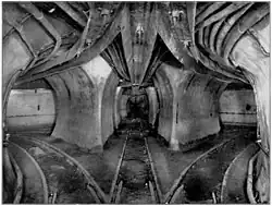 Le nouveau palais de justice du comté de Cook à Chicago fait partie des chantiers de construction qui ont éliminé leurs déblais à travers le système de tunnels[86]. Avant le creusement des tunnels de fret, les fondations superficielles étaient courantes, utilisant des grillages en fer pour répartir le poids lourd là où des bâtiments de grande hauteur étaient impliqués. L'ouverture du système de tunnels a rendu les fondations profondes presque universelles dans les quartiers desservis , à la fois car l'accès au tunnel rendait pratique l'élimination de grands volumes de déblais d'excavation et les sous-sols profonds permettaient un accès facile au tunnel pour le service du charbon et des cendres mais aussi car tunnel menaçait d'ébranler les fondations peu profondes[87].