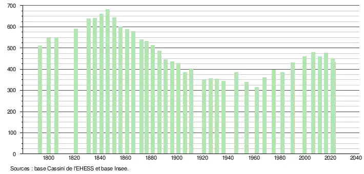L'évolution du nombre d'habitants est connue à travers les recensements de la population effectués dans la commune depuis 1793. Pour les communes de moins de 10 000 habitants, une enquête de recensement portant sur toute la population est réalisée tous les cinq ans, les populations de référence des années intermédiaires étant quant à elles estimées par interpolation ou extrapolation[20]. Pour la commune, le premier recensement exhaustif entrant dans le cadre du nouveau dispositif a été réalisé en 2006[21].