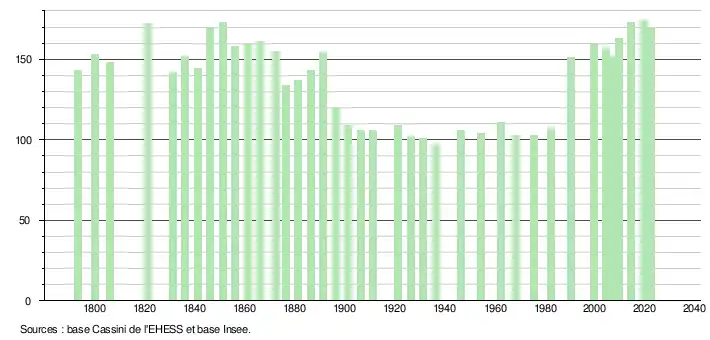 L'évolution du nombre d'habitants est connue à travers les recensements de la population effectués dans la commune depuis 1793. Pour les communes de moins de 10 000 habitants, une enquête de recensement portant sur toute la population est réalisée tous les cinq ans, les populations de référence des années intermédiaires étant quant à elles estimées par interpolation ou extrapolation[23]. Pour la commune, le premier recensement exhaustif entrant dans le cadre du nouveau dispositif a été réalisé en 2004[24].