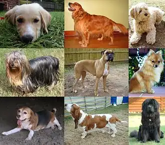 Le chien domestique (Canis lupus familiaris) est une espèce qui comprend près de 400 races et est un exemple évident de diversification phénotypique importante ayant pris place sous l’effet du syndrome de domestication[29]. Certains aspects de la domestication du chien sont généralement admis, comme le fait que l’ancêtre commun de tous les chiens est le loup gris (Canis lupus). Par contre, l’origine et le moment de la domestication du chien restent encore méconnus et controversés. Des preuves indiquent que des traits apparentés aux chiens étaient présents au sein de fossiles qui datent d’avant le maximum de la dernière période glaciaire[30],[31],[32],[33] ce qui entre en contradiction avec les estimations basées sur la génétique qui supposent une divergence plus récente entre les chiens et les loups[34],[35],[36]. Une étude de 2015[37] a tenté d’apporter un éclairage nouveau à cette question : À quand remonte la divergence des ancêtres du chien domestique avec les loups?