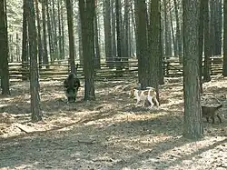 Un chien courant suisse (variété schwytzoise) face à un sanglier.