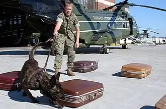 Dans les années 1970, l'U.S. Air Force utilisait plus de 1 600 chiens à travers le monde. En 2003, elle en compte environ 530, stationnés dans le monde entier. Beaucoup de chiens qui opèrent dans ces rôles sont formés à la Lackland Air Force Base au Texas, la seule base des États-Unis qui forme actuellement les chiens à des fins militaires[21].