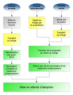 Les chiens des refuges sont pris en charge par des organisations de protection des animaux comme la S.P.A.[2], la branche française de la Société pour la prévention de la cruauté envers les animaux (SPCA) ou la Société royale protectrice des animaux (SRPA) en Belgique[3]. Ces dernières s'occupent des soins vétérinaires, de l'identification des chiens, de leur vaccination, voire de leur stérilisation, avant de les remettre à l'adoption.