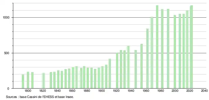 L'évolution du nombre d'habitants est connue à travers les recensements de la population effectués dans la commune depuis 1793. Pour les communes de moins de 10 000 habitants, une enquête de recensement portant sur toute la population est réalisée tous les cinq ans, les populations de référence des années intermédiaires étant quant à elles estimées par interpolation ou extrapolation[25]. Pour la commune, le premier recensement exhaustif entrant dans le cadre du nouveau dispositif a été réalisé en 2006[26].