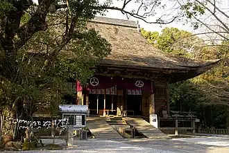 - Hon-dō, fin de l'époque de Muromachi , 5x5 baies, un seul niveau, avec un toit Irimoya-zukuri à croupe couvert de bardeaux, classé (Bien culturel important)[6],[7],[8].