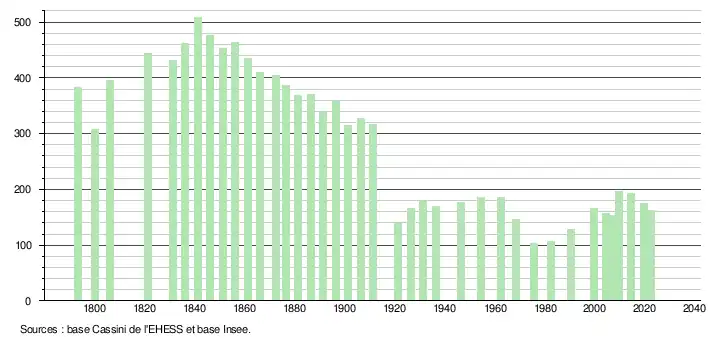L'évolution du nombre d'habitants est connue à travers les recensements de la population effectués dans la commune depuis 1793. Pour les communes de moins de 10 000 habitants, une enquête de recensement portant sur toute la population est réalisée tous les cinq ans, les populations de référence des années intermédiaires étant quant à elles estimées par interpolation ou extrapolation[35]. Pour la commune, le premier recensement exhaustif entrant dans le cadre du nouveau dispositif a été réalisé en 2004[36].