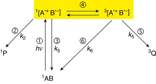 Les états de spin sont liés aux mécanismes de réaction chimiques et biochimiques car des liaisons ne peuvent se former qu'entre deux électrons de spin opposé (règles de Hund). Parfois, lorsqu'une liaison est rompue d'une manière particulière, par exemple lorsqu'elle est frappée par des photons, chaque électron de la liaison se déplace vers chaque molécule respective, et une paire de radicaux est formée. De plus, le spin de chaque électron précédemment impliqué dans la liaison est conservé[1],[2], ce qui signifie que la paire de radicaux maintenant formée est un singulet (chaque électron a un spin opposé, comme dans la liaison d'origine). En tant que telle, la réaction inverse, c'est-à-dire le reformage d'une liaison, appelée recombinaison, se produit facilement. Le mécanisme des paires de radicaux explique comment les champs magnétiques externes peuvent empêcher la recombinaison des paires de radicaux avec les interactions Zeeman, l'interaction entre le spin et un champ magnétique externe, et montre comment une occurrence plus élevée de l'état du triplet accélère les réactions entre radicaux parce que les triplets ne peuvent donner que des produits, et les singulets sont en équilibre avec les réactifs ainsi qu'avec les produits[3].