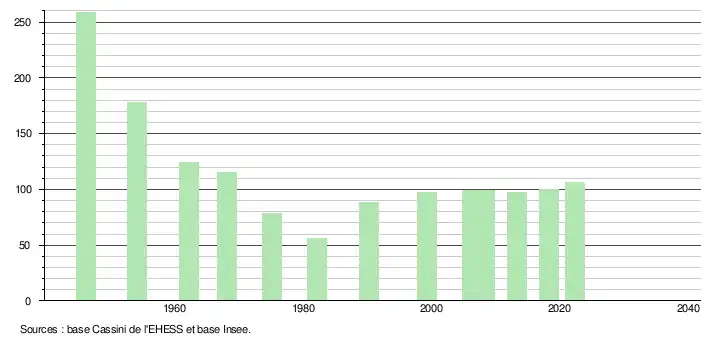 L'évolution du nombre d'habitants est connue à travers les recensements de la population effectués dans la commune depuis 1946. Pour les communes de moins de 10 000 habitants, une enquête de recensement portant sur toute la population est réalisée tous les cinq ans, les populations de référence des années intermédiaires étant quant à elles estimées par interpolation ou extrapolation[10]. Pour la commune, le premier recensement exhaustif entrant dans le cadre du nouveau dispositif a été réalisé en 2008[11].
