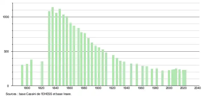 L'évolution du nombre d'habitants est connue à travers les recensements de la population effectués dans la commune depuis 1793. Pour les communes de moins de 10 000 habitants, une enquête de recensement portant sur toute la population est réalisée tous les cinq ans, les populations de référence des années intermédiaires étant quant à elles estimées par interpolation ou extrapolation[27]. Pour la commune, le premier recensement exhaustif entrant dans le cadre du nouveau dispositif a été réalisé en 2004[28].