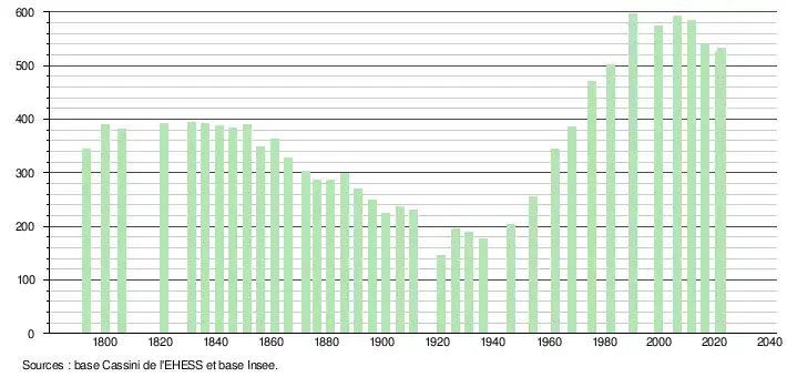 L'évolution du nombre d'habitants est connue à travers les recensements de la population effectués dans la commune depuis 1793. Pour les communes de moins de 10 000 habitants, une enquête de recensement portant sur toute la population est réalisée tous les cinq ans, les populations de référence des années intermédiaires étant quant à elles estimées par interpolation ou extrapolation[22]. Pour la commune, le premier recensement exhaustif entrant dans le cadre du nouveau dispositif a été réalisé en 2006[23].