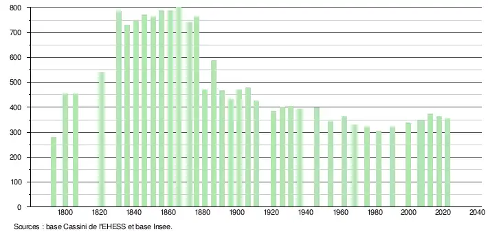L'évolution du nombre d'habitants est connue à travers les recensements de la population effectués dans la commune depuis 1793. Pour les communes de moins de 10 000 habitants, une enquête de recensement portant sur toute la population est réalisée tous les cinq ans, les populations de référence des années intermédiaires étant quant à elles estimées par interpolation ou extrapolation[26]. Pour la commune, le premier recensement exhaustif entrant dans le cadre du nouveau dispositif a été réalisé en 2007[27].