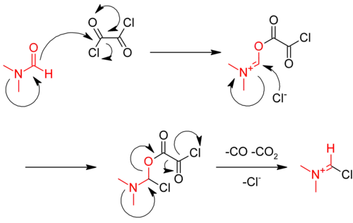 Cette réaction est catalysée par le diméthylformamide (DMF), qui réagit avec le chlorure d'oxalyle dans la première étape pour donner un intermédiaire iminium :
