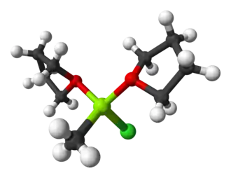 Le chlorure de méthylmagnésium est un composé chimique de formule CH3MgCl. Il s'agit d'un réactif de Grignard disponible dans le commerce, généralement dissous dans le tétrahydrofurane (THF) ; dans ce solvant, il se forme un complexe dans lequel l'atome de magnésium est lié par liaison covalente au groupe méthyle et au chlorure, et par coordination aux atomes d'oxygène de deux molécules de THF.