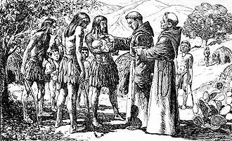 - ↑ Lippy, p. 47: "A matter of debate in reflecting on the role of Spanish missions concerns the degree to which the Spanish colonial regimes regarded the work of the priests as a legitimate religious enterprise and the degree to which it was viewed as a 'frontier institution,' part of a colonial defense program. That is, were Spanish motives based on a desire to promote conversion or on a desire to have religious missions serve as a buffer to protect the main colonial settlements and an aid in controlling the Indians?"