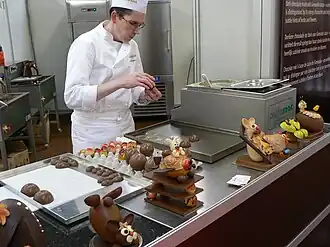 Le chocolatier est un artisan spécialisé dans la fabrication de friandises à base de chocolat (en chocolats, bouchées, œufs de Pâques, etc.)