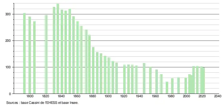 L'évolution du nombre d'habitants est connue à travers les recensements de la population effectués dans la commune depuis 1793. Pour les communes de moins de 10 000 habitants, une enquête de recensement portant sur toute la population est réalisée tous les cinq ans, les populations de référence des années intermédiaires étant quant à elles estimées par interpolation ou extrapolation[28]. Pour la commune, le premier recensement exhaustif entrant dans le cadre du nouveau dispositif a été réalisé en 2004[29].
