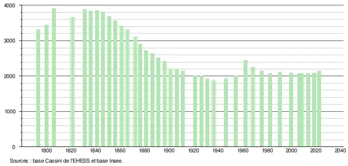 L'évolution du nombre d'habitants est connue à travers les recensements de la population effectués dans la commune depuis 1793. Pour les communes de moins de 10 000 habitants, une enquête de recensement portant sur toute la population est réalisée tous les cinq ans, les populations de référence des années intermédiaires étant quant à elles estimées par interpolation ou extrapolation[41]. Pour la commune, le premier recensement exhaustif entrant dans le cadre du nouveau dispositif a été réalisé en 2008[42].