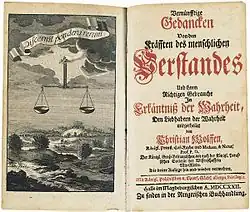 - Vernünfftige Gedancken von den Kräfften des menschlichen Verstandes und ihrem richtigen Gebrauche in Erkäntniß der Wahrheit (Halle, 1712/13, très souvent réédité, traduit en français sous le titre de Logique, ou Réflexion sur les forces de l'entendement humain et sur leur légitime usage dans la connaissance de la vérité par M. Chrétien Wolff, traduite de l'allemand sur la cinquième édition et revue sur toutes les suivantes, par Jean Deschamps, Berlin, 1736; Lausanne et Genève, 1744; traduit en latin par Wolff lui-même sous le titre: Cogitationes rationales de viribus intellectus humani earumque usu legitimo in veritatis cognitione, cum iis qui veritatem amant communicatae et nunc ex sermone germanico in latinum translatae a Christiano Wolfio (Francfort et Leipzig, 1730));