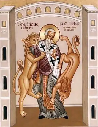 Ignace d'Antioche (également connu sous le nom de Théophorus) était le troisième évêque ou patriarche d'Antioche et un élève de l'apôtre Jean. En route vers son martyre à Rome, Ignace a écrit une série de lettres qui ont été conservées comme un exemple de la théologie des premiers chrétiens. Les sujets importants abordés dans ces lettres comprennent l'ecclésiologie, les sacrements, le rôle des évêques et le sabbat biblique[74]. Il est le deuxième après Clément à mentionner les épîtres de Paul[75].