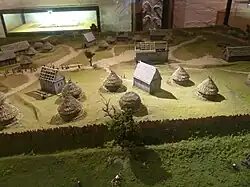 Abbaye de Bangor fondée en 558, avec son enclos et ses huttes.