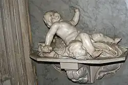 - Deux petits anges et deux têtes de chérubins[21],[22]. Il s'agit d'un support de tabernacle en marbre blanc et incrustations de marbres roses provenant de l'église des Minimes de Toulon[23] ;