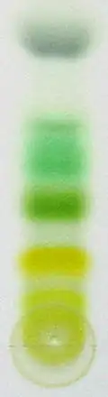 Chromatographie sur couche mince faisant apparaître les composants d'une plante verte, dont la chlorophylle. Il est probable que la séparation de pigments inspira le nom de la méthode.