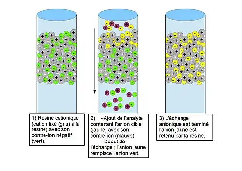 Lors d’un échange anionique, une résine cationique est utilisée (étape n°1). L’ajout de l’analyte provoque le remplacement du contre-ion de la résine par celui de l’ion soluté (étape 2). Lorsque le contre-ion du site d'échange d'ions est remplacé par un ion soluté (étape 3), celui-ci est temporairement retenu par la charge fixe. Les divers ions analytes restent pendant une période différente dans la colonne en raison de leurs affinités différentes vis-à-vis de la phase stationnaire, et ainsi, la séparation est provoquée. Si un échantillon avec les anions A− et B− est injecté dans la colonne, on échange ces anions par des anions compétiteurs de la colonne selon le processus d'équilibre réversible donné par les équations suivantes[6] :