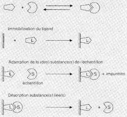 La molécule d'intérêt se fixe donc à la matrice et les autres composants sont élués. Puis on détache celle-ci de la matrice, ainsi la molécule est purifiée. Pour pouvoir séparer des composants par cette méthode, il faut donc connaître la structure et la spécificité de la molécule d'intérêt afin de choisir un bon ligand, c'est-à-dire que le ligand ne doit pas accrocher d'autres composés que la molécule.
